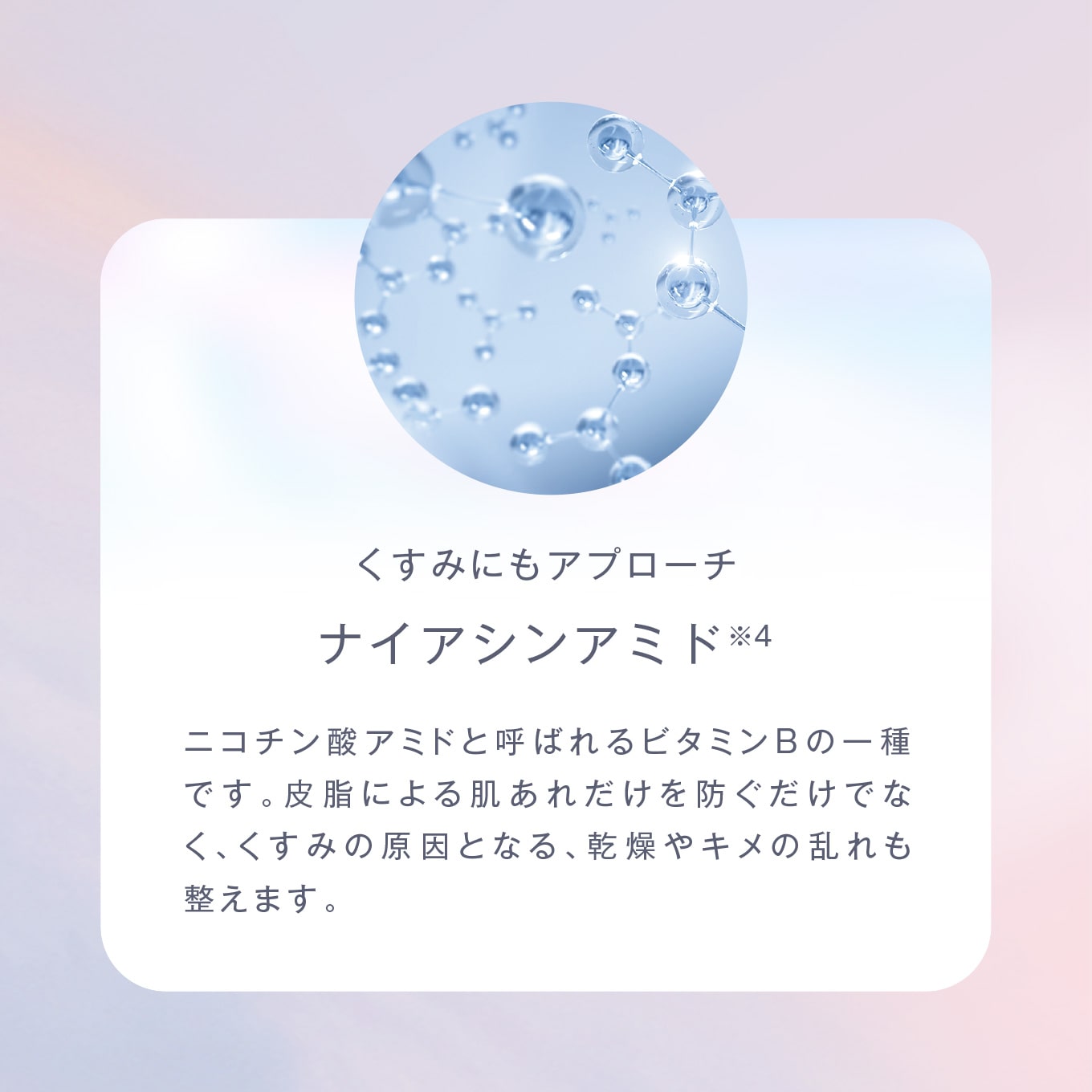 | 成分 | 水、ペンチレングリコール、BG、ナイアシンアミド、パンテノール、アゼロイルジグリシンK、グリシルグリシン、グリチルリチン酸2K、(アスコルビル/トコフェリル)リン酸K、セバシン酸、10-ヒドロキシデカン酸、1,10-デカンジオール、アラントイン、テトラヘキシルデカン酸アスコルビル、トロメタミン、マンデル酸、DPG、PEG-32、PEG-75、EDTA-2Na、PPG-6デシルテトラデセス-30、エクオール、PEG-60水添ヒマシ油、クエン酸、クエン酸Na、フェノキシエタノール、1,2-ヘキサンジオール |