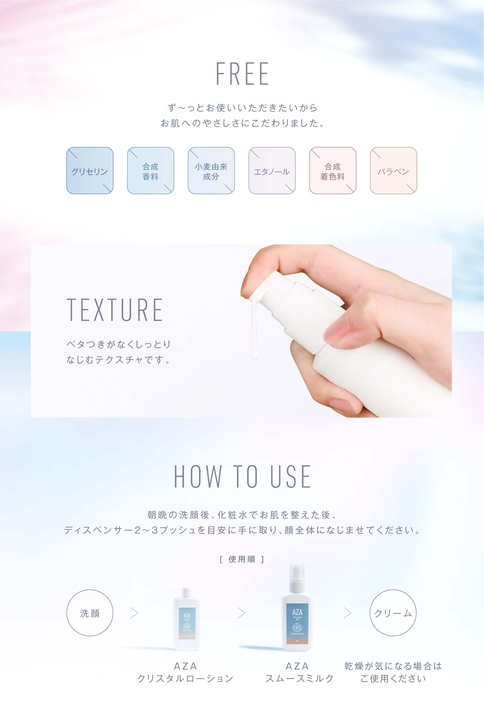 | ご使用方法 | 朝晩の洗顔後、化粧水でお肌を整えた後、ディスペンサー2~3プッシュを目安に手に取り、顔全体になじませてください。 |